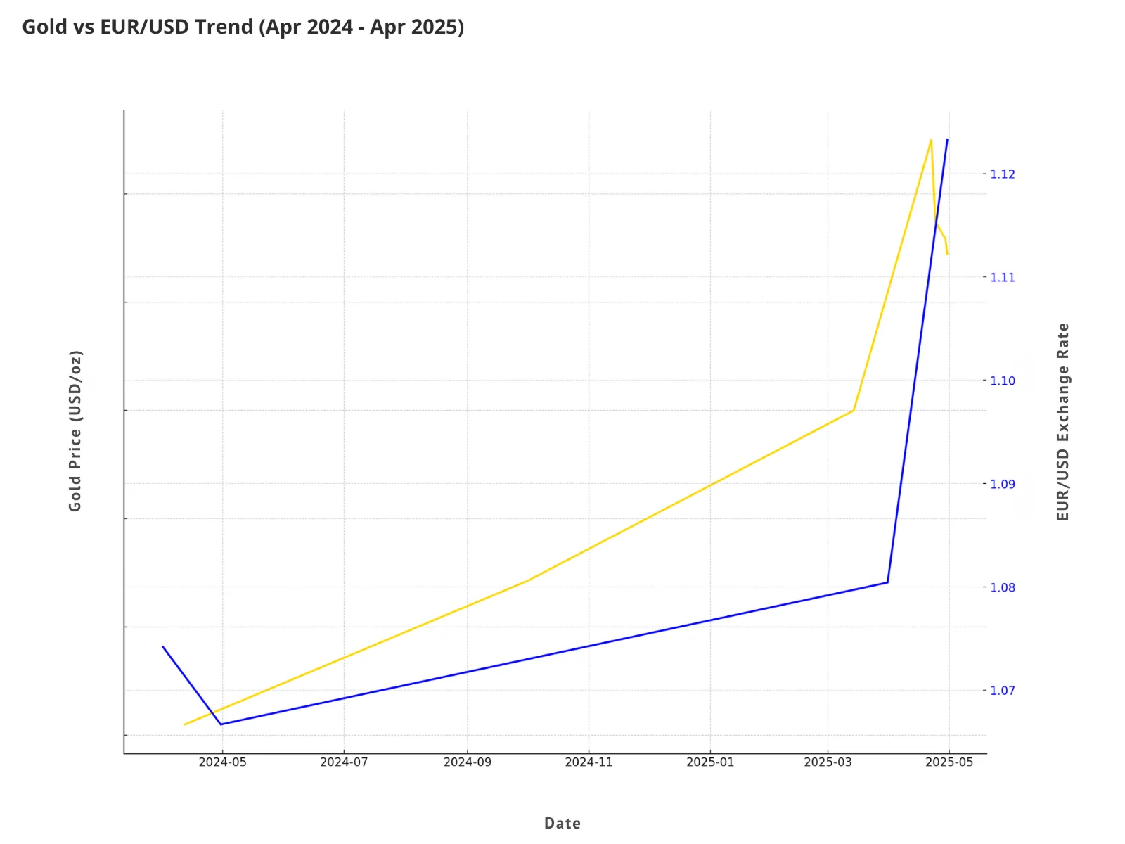 Image: Comparative chart of gold vs EUR/USD trend, April 2024 – April 2025.