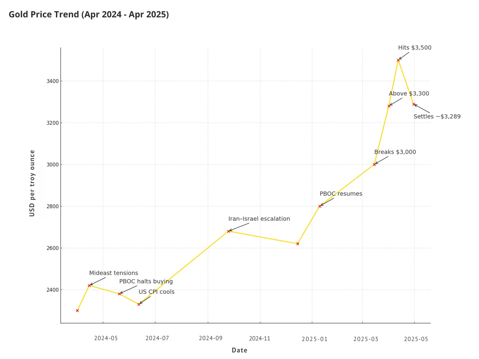 Image: Line chart showing gold price trend from April 2024 to April 2025 with annotations highlighting key macro events.