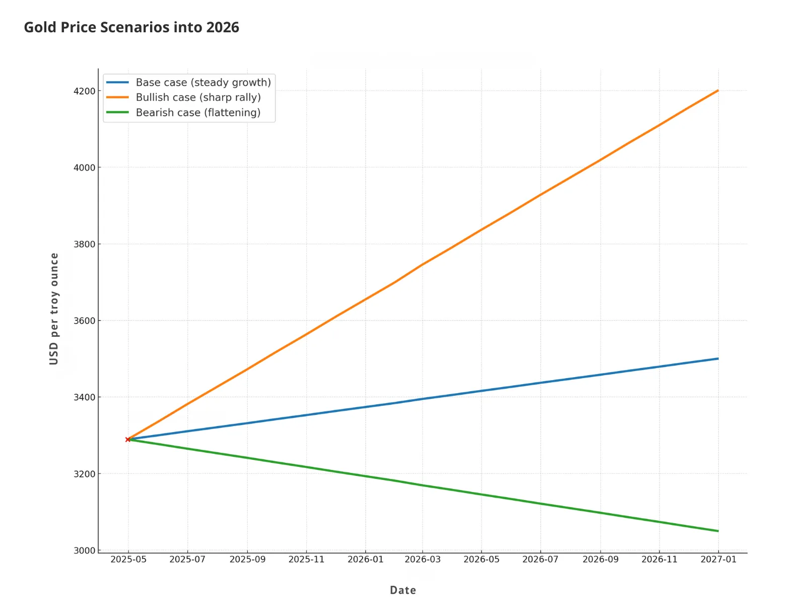 Image: Scenario chart showing base case (steady growth), bullish case (sharp rally), and bearish case (flattening prices) for gold into 2026.